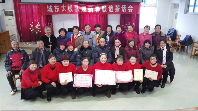 聯誼會上,太極隊隊長胡建軍發言說:“城東太極隊在過去的一年里,多次參加射陽縣舉辦的各項中老年人的活動,并屢次獲獎。希望大家在新的一年里,繼續發揚團結友愛的精神,齊健身、同歡樂。”