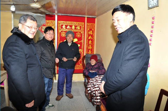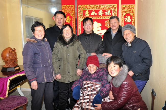 “我們黨政工領(lǐng)導(dǎo)來(lái)給您拜年了!”王進(jìn)強(qiáng)一進(jìn)門(mén)就對(duì)坐在沙發(fā)上的百歲老人說(shuō)。