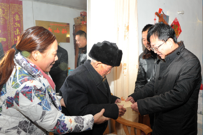 “今天我們代表農(nóng)場(chǎng)的黨政工領(lǐng)導(dǎo)一起來(lái)慰問(wèn)百歲老人,祝愿老人福如東海、壽比南山。”王進(jìn)強(qiáng)一邊把一封裝有慰問(wèn)金的信封交到老子的兒女手中,一邊熱情地說(shuō)道。