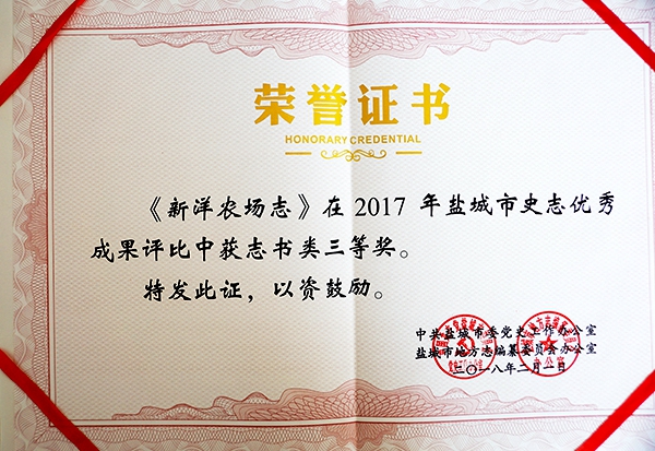 近日,在鹽城市委黨史工作辦公室、地方志編纂委員會辦公室開展的2017年鹽城市史志優秀成果評選活動中,榮獲志書三等獎。