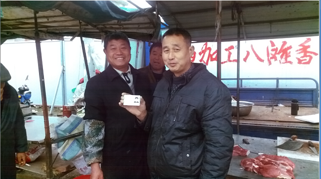 這時,徐加才已經將油條燒餅裝在塑料袋里,欲往仇冬生的口袋里硬揣,仇冬生急忙將它退回。兩人一送一退,禮讓了好幾個回合。仇冬生看這樣推讓下去也不是個辦法,于是,他委婉地說:“您的情我領下了。不過,我從小到大不喜歡吃油條、燒餅。這樣,我把您送給我的這份油條燒餅存您這里,您幫我出售,過幾天我到您這里來取‘錢’”。仇冬生一番詼諧幽默的語言,頓時將失主徐加才給逗樂了。徐加才對仇冬生說的幽默話心領神會,執意要答謝仇冬生的念頭也打消了。圖為4月12日上午,仇冬生將拾到的身份證交還給失主徐加才。