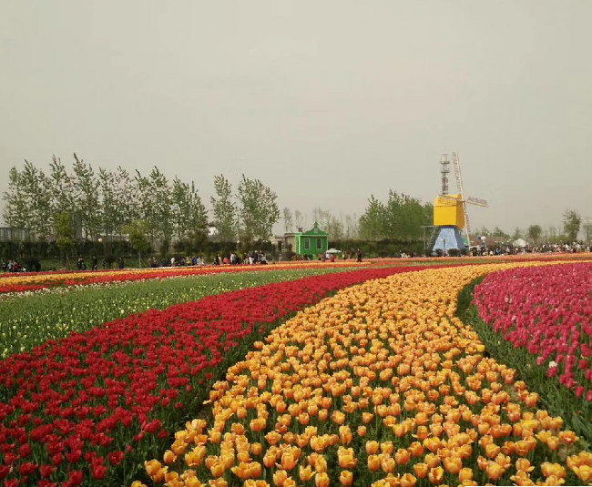 域外的風車、郁金香和來自全國各地超高的人氣特別是那種紅、黃、白、褐、紫、橙等多種花色在春風中搖曳,或交織而行,或獨立成簇,在高低起伏的土丘上隨意地流淌,如天上瑰麗的云彩,又像仙女們織出的緞綢令人感到流光溢彩精彩絕倫,看了花海就使心情更加愉悅起來,花海中的荷風半島、水岸印象、多彩秀湖、智能莊園的荷蘭風格元素,在美侖美奐又色彩斑斕郁金香的襯托下,恍若置身在荷蘭國度的感覺。