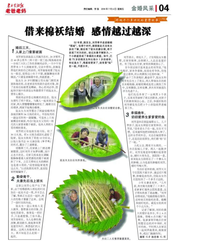 在今天出版的東方生活報(bào)四版《金婚風(fēng)采》欄目上,全版刊登了淮海農(nóng)場退休老人陸友生和劉芳結(jié)婚52年來的愛情故事,這也是該欄目今年以來,第7次以整版的文字和圖片形式,刊載淮海老人的愛情故事。現(xiàn)轉(zhuǎn)摘東方生活報(bào)上這篇金婚故事,讓大家一睹為快。