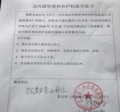 9月28日下午盱眙縣交通局相關負責人來到三河農場有限公司簽訂《雙興路管理和養護權限交接書》,正式接管三河農場雙興路。