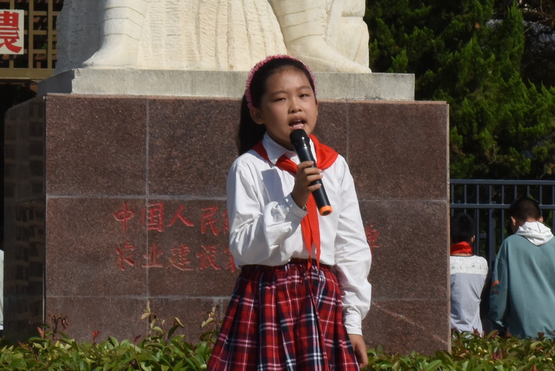 “各位同學,早上好,歡迎大家到我們農建四師陳列館參觀!我是淮海農場學校二年級學生于曉冉,也是我們陳列館的編外義務講解員,下面就由我來給大家介紹我們館的紀念碑白玉雕像……”9月28日上午,淮海農場小學二年級于曉冉,她作為農建四師的紅色小小講解員,開啟了為學校學生講述發生在農建四師軍墾傳統的紅色故事。