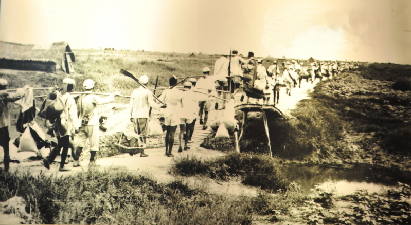 當(dāng)年農(nóng)場(chǎng)的冬天風(fēng)寒雪嘯,冷氣襲人,他們?cè)谔旌貎龅沫h(huán)境下敲冰挖泥、打壩戽水,嘴凍青了,腳凍麻了,沒(méi)有人下火線。連隊(duì)的生活供應(yīng),要買個(gè)新鮮蔬菜,少則跑二三十里,多則七八十里,他們用板車是一步一磕頭的拉回來(lái);有的連隊(duì)長(zhǎng)期參加重體力活,糧食超支很多,事務(wù)長(zhǎng)只好買豆餅回來(lái)補(bǔ)充糧食。戰(zhàn)士們說(shuō)的好:“困難如彈簧,看你強(qiáng)不強(qiáng),你強(qiáng)它就弱,你弱它就強(qiáng)?!睘榱思涌旃こ探ㄔO(shè),他們?yōu)樽约禾岢隽恕叭取保ū燃t軍、比志愿軍、比民工),“五不怕”(不怕天寒、不怕地凍、不怕淤泥、不怕下水、不怕工多)的戰(zhàn)斗口號(hào),戰(zhàn)勝了困難,發(fā)揮了中國(guó)人民解放軍艱苦奮斗的優(yōu)良傳統(tǒng)。在那艱苦而特殊的年代里,“建設(shè)美好的家園”,已成為他們共同的理想。