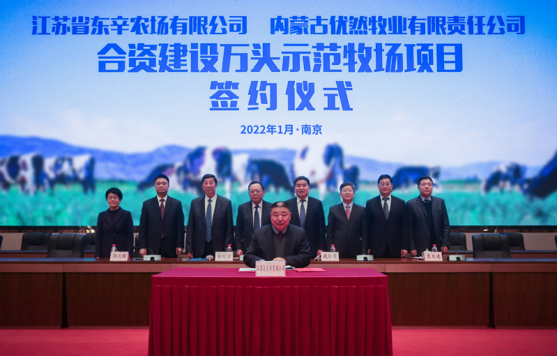 1月12日,東辛農場公司與內蒙古伊利集團優然牧業公司合資建設萬頭示范牧場項目正式簽約。本次簽約儀式采用視頻會議形式進行,省委農辦主任、省農業農村廳廳長楊時云,總畜牧獸醫師袁日進,集團公司黨委書記、董事長魏紅軍,總經理胡兆輝,副總經理姜建友、王立新,總法律顧問吳以國、總經理助理錢伯彬、董事會秘書孟亞平在南京出席儀式,伊利集團董事長潘剛,執行總裁張劍秋,副總裁劉剛、晁德文在呼和浩特出席儀式。袁日進、胡兆輝、張劍秋分別代表三方致辭,姜建友主持簽約儀式。
