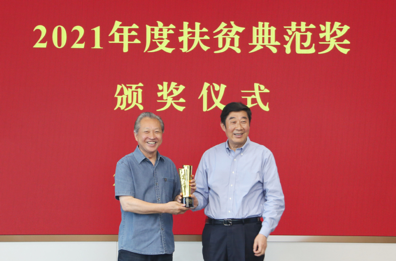 座談會期間,趙鵬向集團公司頒發了2021年度江蘇婦女兒童慈善杰出貢獻單位獎牌和第十一屆公益節-2021年度扶貧典范獎獎杯。