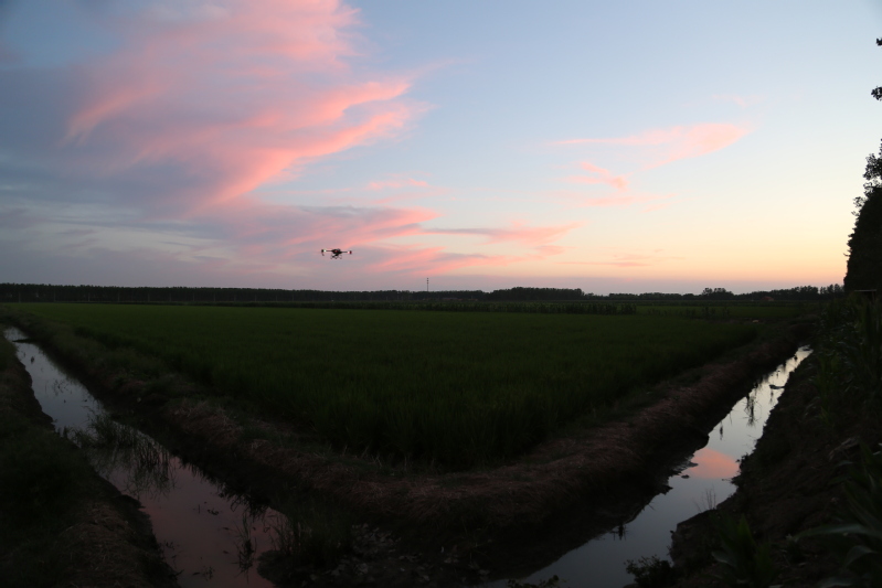 眼下正是水稻產量形成的關鍵時期,也是病蟲害高發時期。連日來,崗埠分公司組織農業科、生產區農技人員和大隊管理員,著眼紋枯病、稻曲病、稻縱卷葉螟、稻飛虱等高發病蟲害,深入田間展開排查統計,分類施策,科學開展肥水管理和綠色防控,抓好4.5萬畝水稻的穗期管理工作?!盁o人機夜間對水稻進行病蟲害綜合防治作業,避開白天高溫作業風險,大大提升作業效率,一臺無人機每小時可噴灑150畝,有力加速防治進程?!睄彶悍止巨r業中心負責人表示,無人機飛防不僅作業效率快,防治效果好,減少農藥使用量,降低農業生產成本,且能大大降低勞動強度,一舉多得。當前正是穗期水稻病蟲害綜合防治關鍵節點,分公司共組織無人機40余臺,采取夜間操作,確保在規定防治時間內完成防治任務,為秋糧豐收打好基礎。