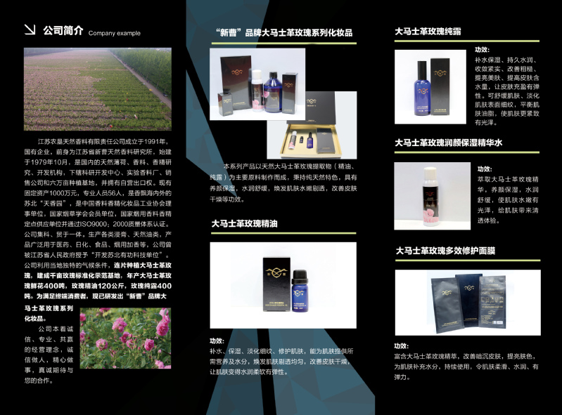 “新曹”牌大馬士革玫瑰系列產(chǎn)品:我公司與上海愛伽儷日用品公司聯(lián)姻,生產(chǎn)出“新曹”牌大馬士革玫瑰面膜、精華液、純露、復(fù)方精油系列化妝品。新曹香料人始終堅(jiān)持產(chǎn)品高起點(diǎn)、高品質(zhì),工薪階層價(jià)格定位,深受北京、上海、廣東、深圳等一線城市消費(fèi)者喜愛。
