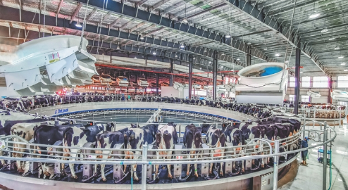 在連云港市東辛農(nóng)場萬頭牧場內(nèi),兩臺80位轉(zhuǎn)盤式奶牛擠奶設(shè)備正在運(yùn)行,科學(xué)擠奶方式既降低了人力成本,更使擠奶效率大幅提高,全程機(jī)器操作,避免人工污染,從源頭保障奶品品質(zhì)。