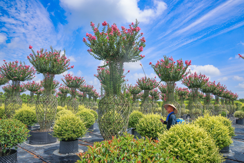 8月14日,在江蘇省鹽城市射陽縣,江蘇農(nóng)墾新洋農(nóng)場容器苗項目基地,管理人員正在養(yǎng)護(hù)紫薇花瓶。近年來,新洋農(nóng)場利用容器苗基地優(yōu)勢,在栽培方式上大膽嘗試,通過扦插培育,實現(xiàn)了自繁自育栽培技術(shù)的新突破,容器栽培的模式使苗圃成活率更高、綠化效果更好,優(yōu)良的品質(zhì)廣受全國各地綠化項目方的青睞。