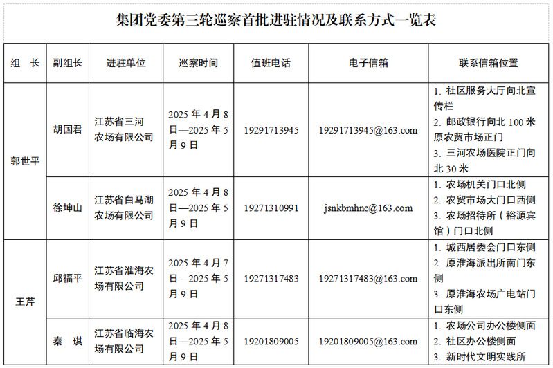 集團黨委巡察組將在被巡察農場現場巡察1個月左右,期間設立專門值班電話、電子信箱、聯系信箱等,主要受理反映被巡察農場黨委領導班子及其成員、相關重點崗位干部(含已離退休、已調離)問題的來信來電來訪,重點是關于違反政治紀律、組織紀律、廉潔紀律、群眾紀律、工作紀律和生活紀律等方面的舉報和反映。其他不屬于巡察受理范圍的信訪問題,將按規定由有關部門認真處理。信訪受理時間截止到2025年5月7日。