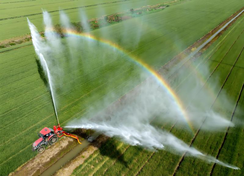 5月2日,正值冬小麥進入開花灌漿關鍵期,江蘇省農墾白馬湖農場調集10多臺噴水機進行分區抗旱作業,確保近5萬畝冬小麥增產增收。圖為工作人員駕駛噴水機對麥田進行噴灌作業。賀敬華 攝 (視覺江蘇網供圖)