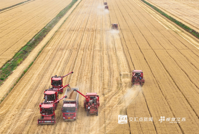 (特約攝影 許昌銀 錢厚紅 15:24攝 20:39上線)五月的麥田,金穗飄香。5月26日,淮安盱眙洪澤湖畔的江蘇農墾三河農場的3.82萬畝小麥開鐮收割。當地利用晴好天氣加緊收割,確保顆粒歸倉。