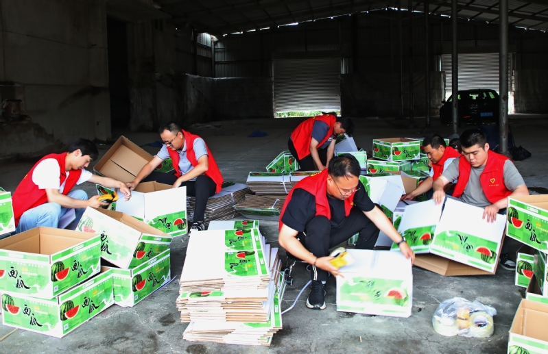 日前,南通江心沙農場接到一筆1300余箱西瓜訂單,急需人手幫助進行包裝、搬運等作業。江心沙農場團委第一時間動員全場團員青年組建機動突擊隊到田間地頭和倉庫幫忙,全力以赴趕訂單,讓“志愿紅”成為產業“虹”的亮麗底色。 袁偉 許叢軍 攝