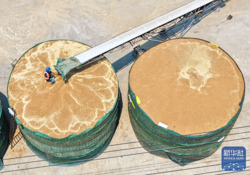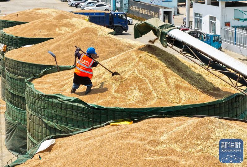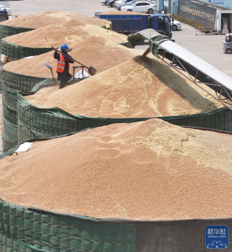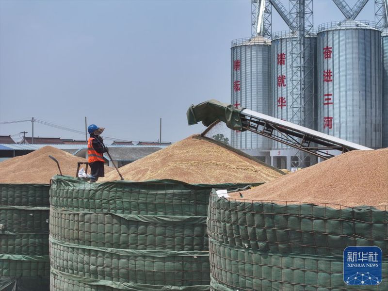 三河農(nóng)場(chǎng)收獲的小麥進(jìn)入大華種業(yè)三河分公司存儲(chǔ)(5月28日攝,無(wú)人機(jī)照片)。新華社發(fā)(許昌銀攝)