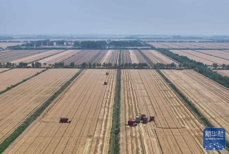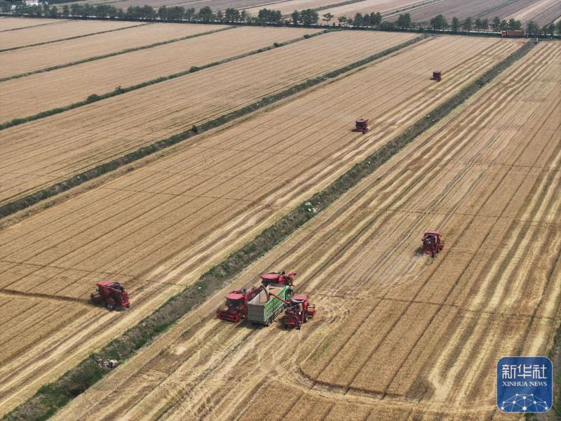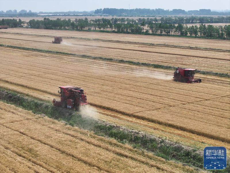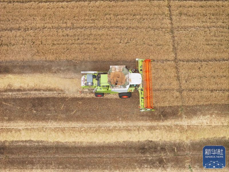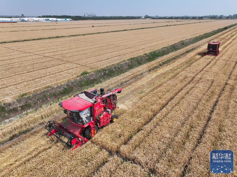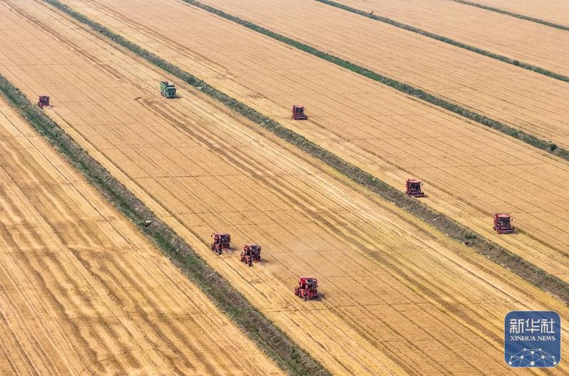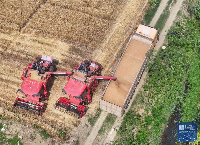 5月28日,收割機(jī)在三河農(nóng)場(chǎng)收割小麥(無(wú)人機(jī)照片)。新華社記者 季春鵬 攝