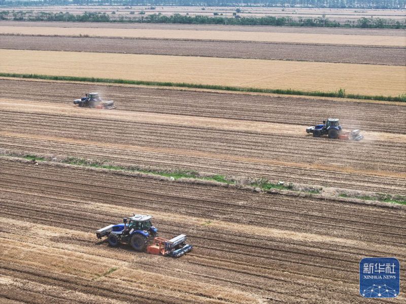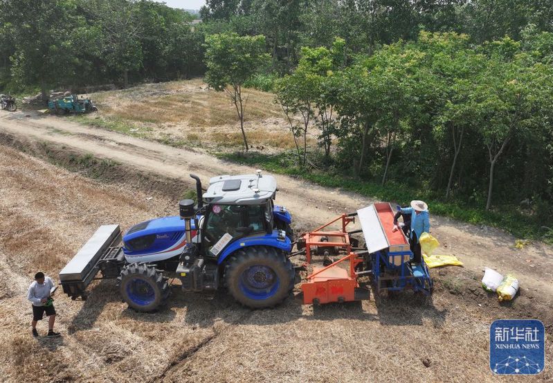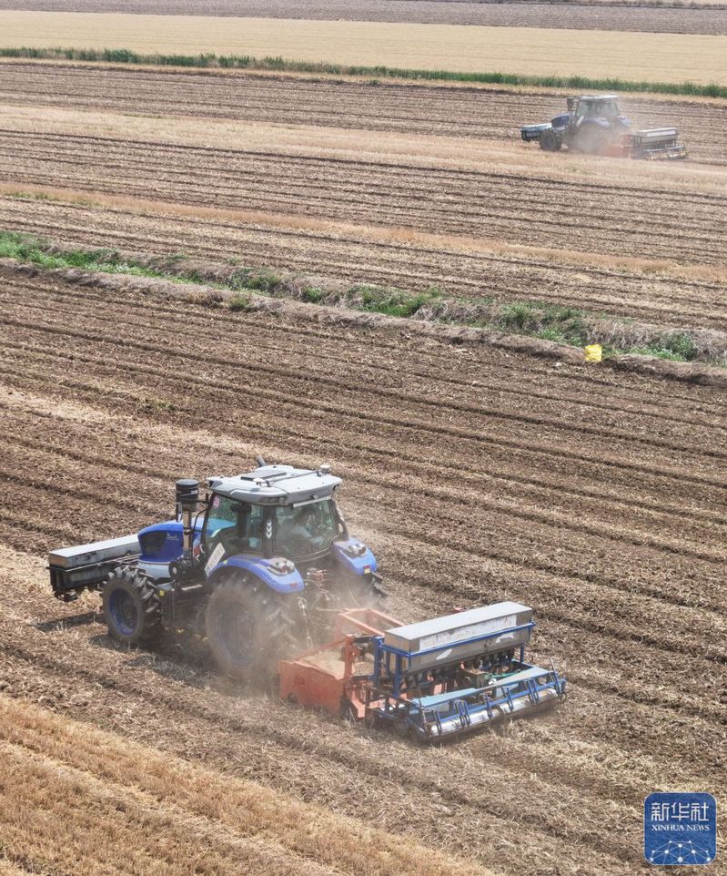 5月28日,揚(yáng)州大學(xué)研制的“九合一”稻麥耕播機(jī)在三河農(nóng)場(chǎng)播稻種(無(wú)人機(jī)照片)。新華社記者 季春鵬 攝