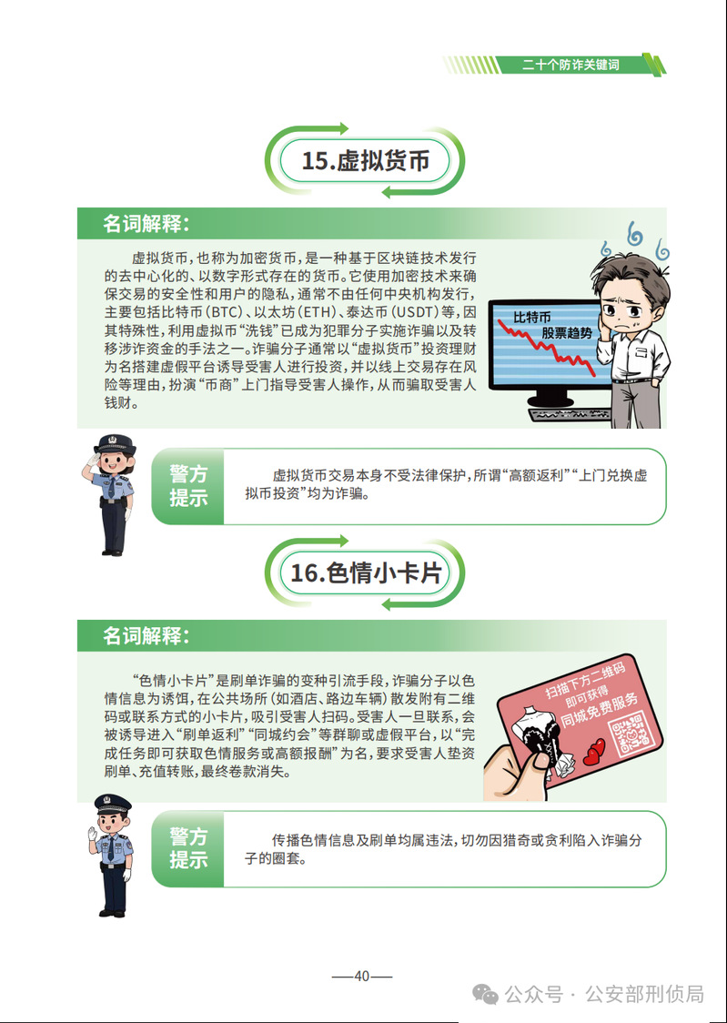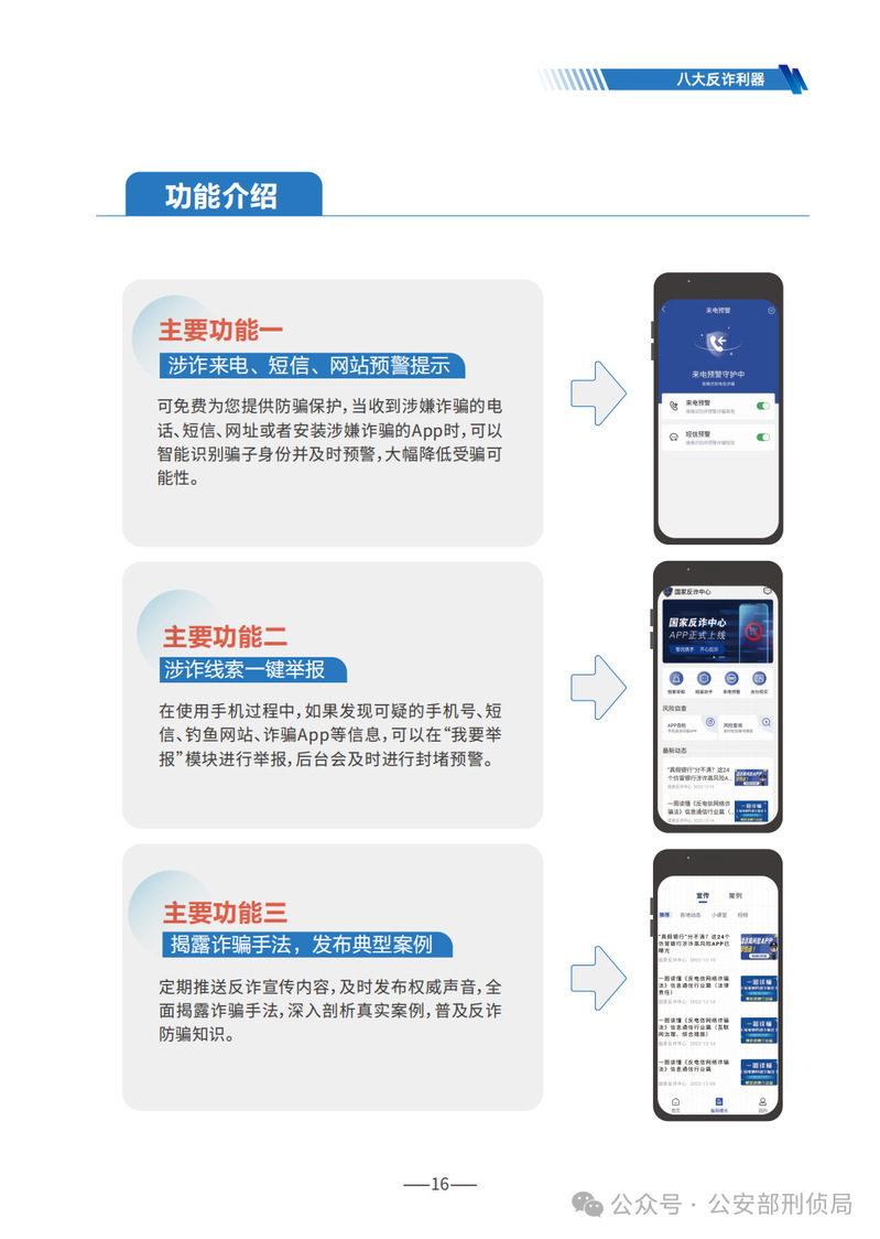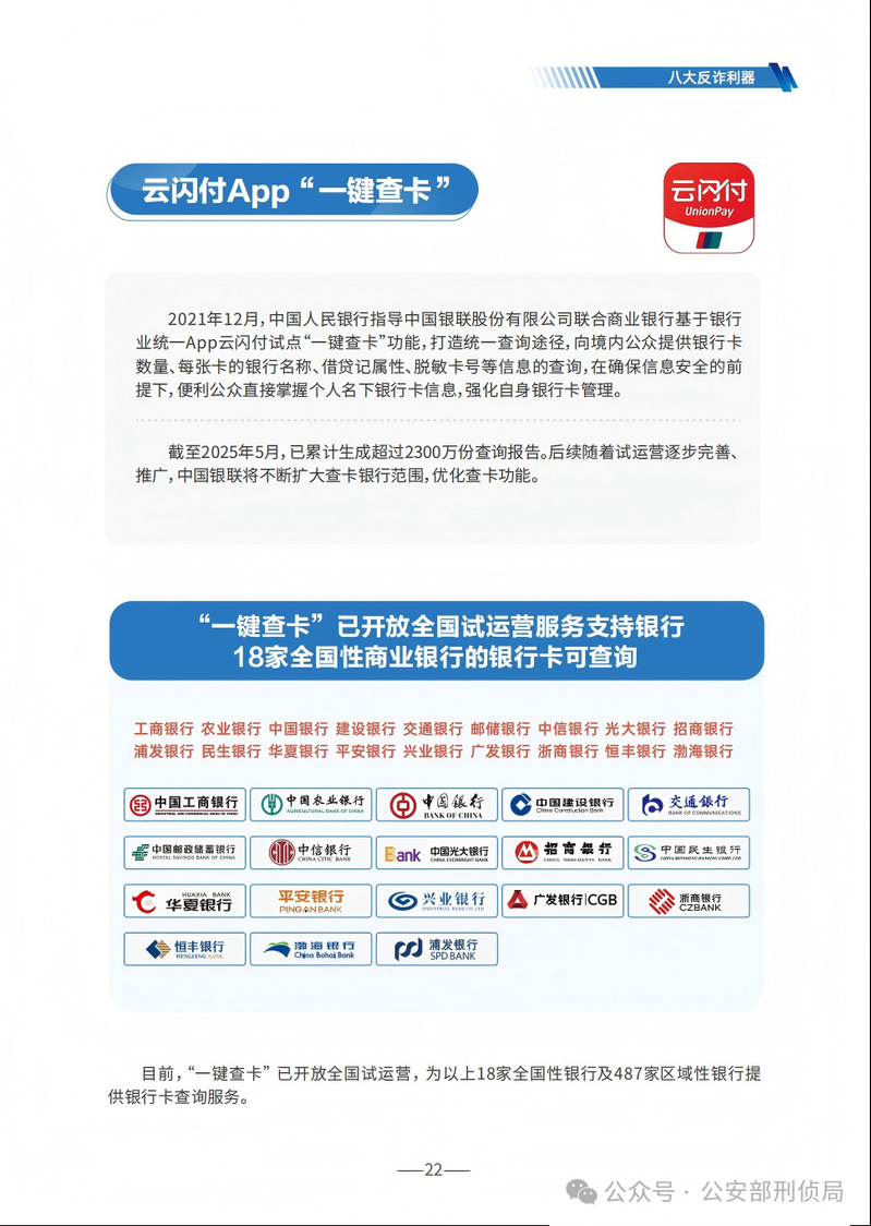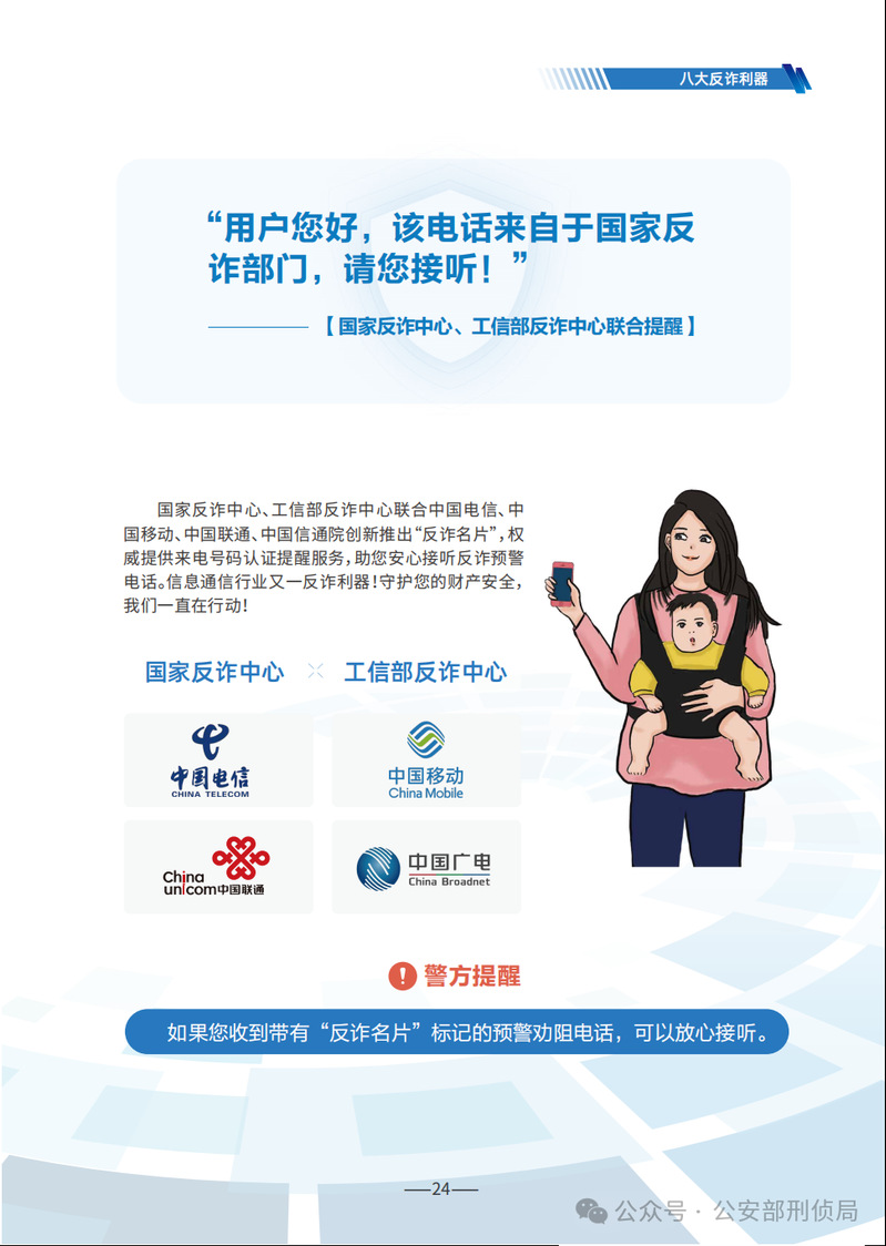 《手冊》詳細(xì)梳理了刷單返利、虛假網(wǎng)絡(luò)投資理財、虛假購物服務(wù)、冒充電商物流客服、貸款征信、冒充領(lǐng)導(dǎo)熟人、冒充公檢法、婚戀交友、網(wǎng)絡(luò)游戲產(chǎn)品虛假交易、機(jī)票退改簽等10類高發(fā)的電信網(wǎng)絡(luò)詐騙類型,通過典型案例剖析,逐個解析詐騙套路,揭批作案手法,為易受騙群體“量身定制”反詐防騙提示。同時,《手冊》詳細(xì)介紹了前期公安部會同工信部、中國人民銀行推出的七大反詐利器——國家反詐中心APP、96110預(yù)警勸阻專線、12381涉詐預(yù)警勸阻短信系統(tǒng)、全國移動電話卡“一證通查”、全國互聯(lián)網(wǎng)賬號“一證通查”、反詐名片、云閃付APP“一鍵查卡”,以及今年工信部推出的第八個反詐利器——跨境提醒服務(wù),幫助群眾有效甄別境外來電。此外,《手冊》首次總結(jié)提煉了幫助群眾快速破譯騙局的20個防詐關(guān)鍵詞,切實構(gòu)筑攔截電信網(wǎng)絡(luò)詐騙的“防火墻”。
