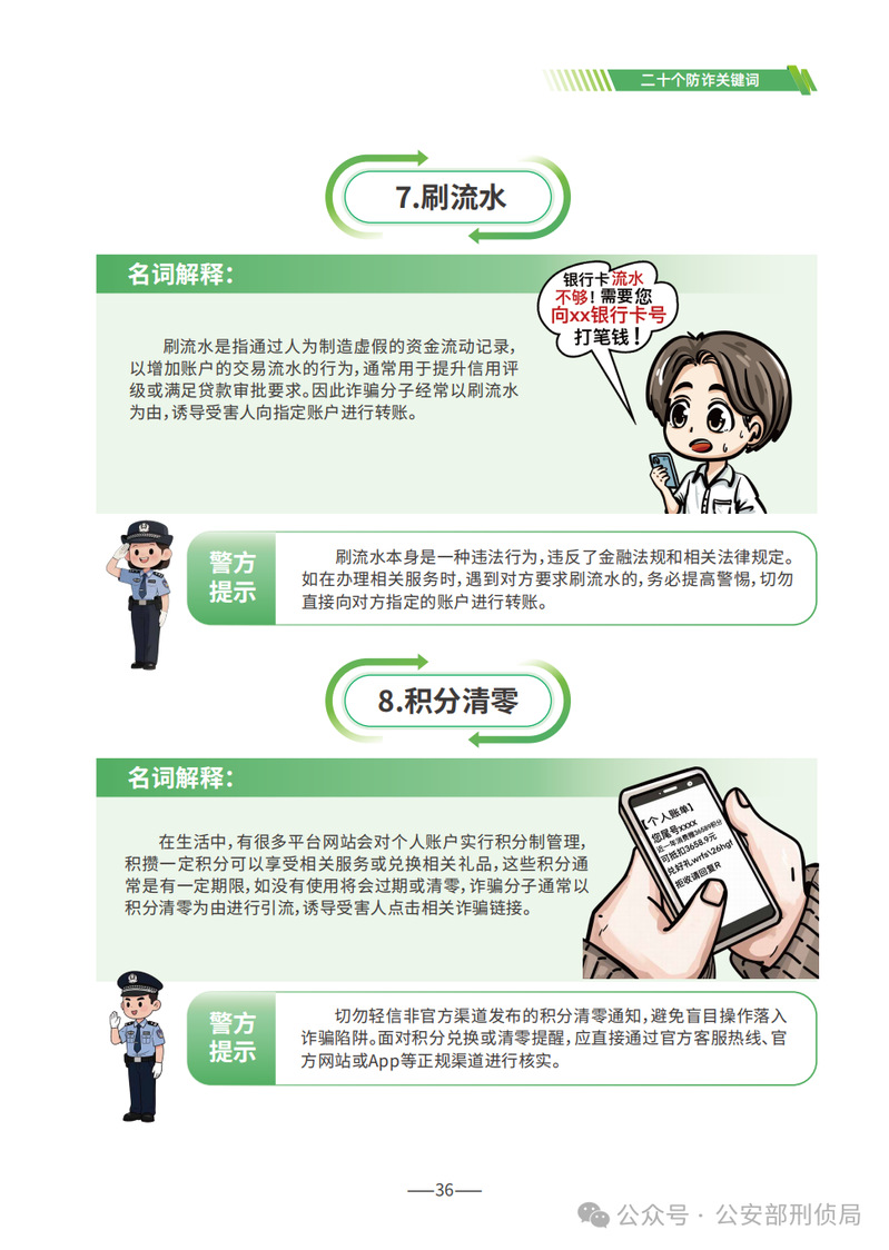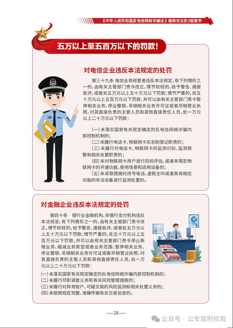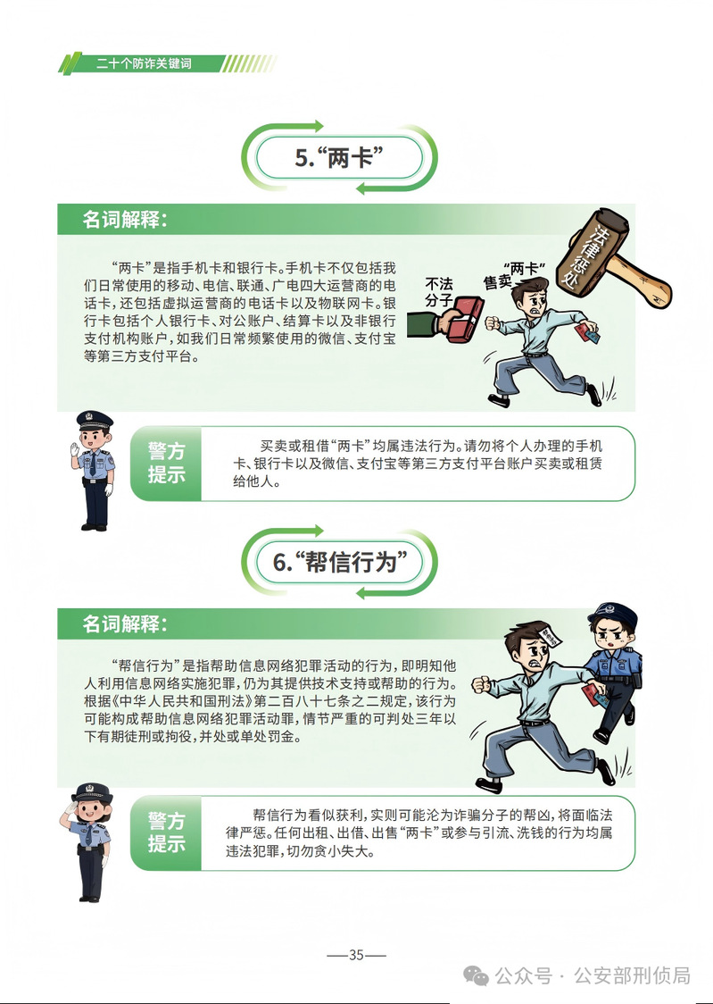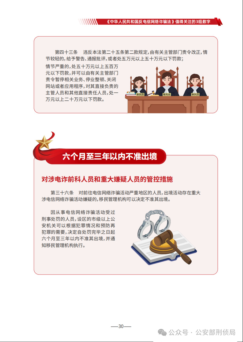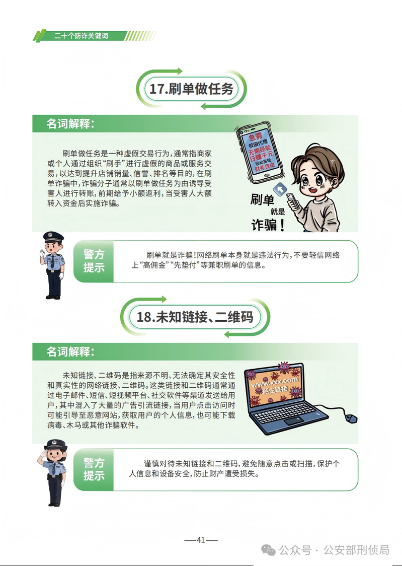 《手冊》詳細(xì)梳理了刷單返利、虛假網(wǎng)絡(luò)投資理財、虛假購物服務(wù)、冒充電商物流客服、貸款征信、冒充領(lǐng)導(dǎo)熟人、冒充公檢法、婚戀交友、網(wǎng)絡(luò)游戲產(chǎn)品虛假交易、機(jī)票退改簽等10類高發(fā)的電信網(wǎng)絡(luò)詐騙類型,通過典型案例剖析,逐個解析詐騙套路,揭批作案手法,為易受騙群體“量身定制”反詐防騙提示。同時,《手冊》詳細(xì)介紹了前期公安部會同工信部、中國人民銀行推出的七大反詐利器——國家反詐中心APP、96110預(yù)警勸阻專線、12381涉詐預(yù)警勸阻短信系統(tǒng)、全國移動電話卡“一證通查”、全國互聯(lián)網(wǎng)賬號“一證通查”、反詐名片、云閃付APP“一鍵查卡”,以及今年工信部推出的第八個反詐利器——跨境提醒服務(wù),幫助群眾有效甄別境外來電。此外,《手冊》首次總結(jié)提煉了幫助群眾快速破譯騙局的20個防詐關(guān)鍵詞,切實構(gòu)筑攔截電信網(wǎng)絡(luò)詐騙的“防火墻”。