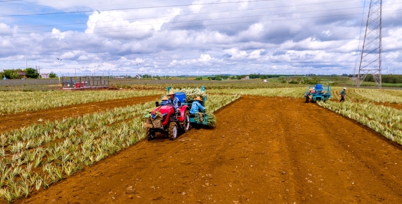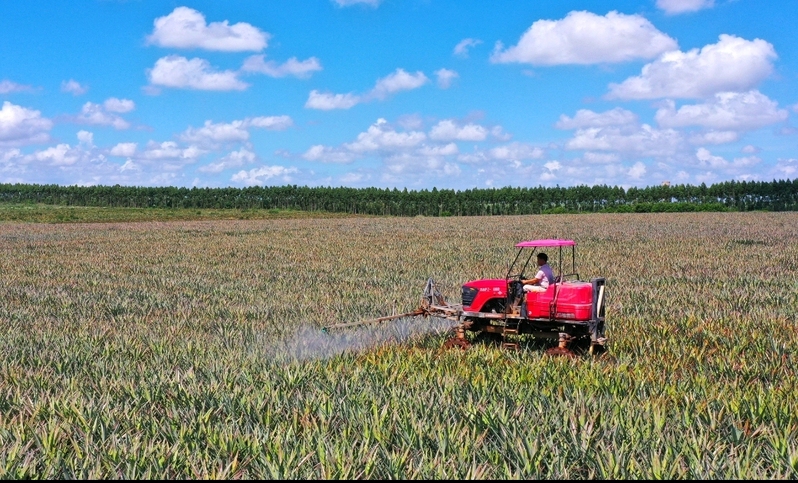 友好農場的萬畝菠蘿田處于菠蘿生長黃金地帶,早期主要種植巴厘品種,占總面積的98%以上。由于種植存在品種單一、管理粗放、單價低等問題,一度出現“農戶不敢種,商人不敢收”的窘境。2021年以來,友好農場利用菠蘿產業強鎮項目,引進臺農16號、17號等優質鳳梨品種,篩選出果肉嫩滑、酸甜適中的臺農17號等優良品種,試驗示范種植480畝,并通過GPS定位、蓋膜、電石催花、果實套袋等技術創新,努力攻克鳳梨管理技術難題,實現了畝均利潤近3000元,讓農戶的“傷心果”變成了“致富果”。如今標準化種植模式已帶動30戶農戶種植臺農17號、芒果鳳梨、冬蜜鳳梨等新品。農場計劃3年內實現1萬畝新品種示范規模,覆蓋率達50%以上。