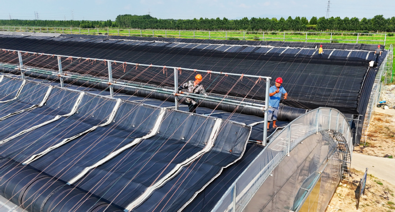 7月29日,連云港市海州區崗埠農場,工作人員正在檢查、加固蔬菜大棚,防范臺風“竹節草”。 耿玉和 徐衛 攝(視覺江蘇網供圖)