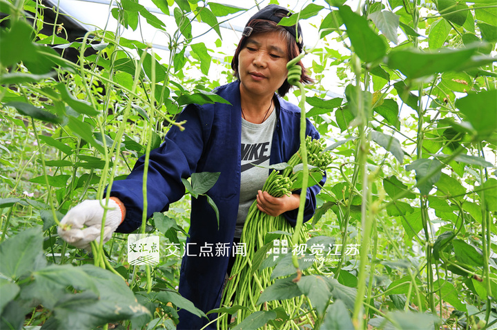 9月17日,連云港市海州區的江蘇農墾崗埠農場,種植戶在溫室大棚里采收成熟的豇豆,準備供應市場銷售。徐衛 攝 視覺江蘇網供圖