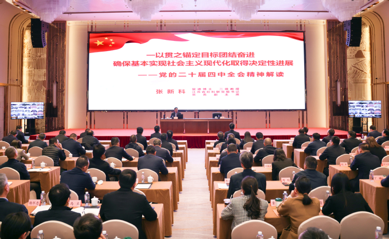 報(bào)告會(huì)上,張新科圍繞學(xué)習(xí)貫徹習(xí)近平總書記在黨的二十屆四中全會(huì)上的重要講話精神和全會(huì)《建議》,從深刻認(rèn)識(shí)黨的二十屆四中全會(huì)的重大意義,準(zhǔn)確把握“十五五”時(shí)期在基本實(shí)現(xiàn)社會(huì)主義現(xiàn)代化進(jìn)程中的重要地位,全面理解“十五五”時(shí)期經(jīng)濟(jì)社會(huì)發(fā)展的戰(zhàn)略任務(wù)和重大舉措等方面,結(jié)合我國(guó)經(jīng)濟(jì)社會(huì)發(fā)展實(shí)際情況,運(yùn)用生動(dòng)案例和翔實(shí)數(shù)據(jù),進(jìn)行了系統(tǒng)闡釋和全面解讀。他指出,全會(huì)取得的重大成果、作出的重大部署,充分體現(xiàn)了以習(xí)近平同志為核心的黨中央團(tuán)結(jié)帶領(lǐng)全黨全國(guó)各族人民續(xù)寫經(jīng)濟(jì)快速發(fā)展和社會(huì)長(zhǎng)期穩(wěn)定兩大奇跡新篇章、奮力開創(chuàng)中國(guó)式現(xiàn)代化建設(shè)新局面的歷史主動(dòng),必將對(duì)黨和國(guó)家事業(yè)發(fā)展產(chǎn)生重大而深遠(yuǎn)的影響。要把學(xué)習(xí)貫徹全會(huì)精神同學(xué)習(xí)領(lǐng)會(huì)習(xí)近平新時(shí)代中國(guó)特色社會(huì)主義思想貫通起來,結(jié)合習(xí)近平總書記對(duì)江蘇工作重要講話精神,做到學(xué)深悟透、狠抓落實(shí),奮力譜寫“強(qiáng)富美高”新江蘇現(xiàn)代化建設(shè)新篇章。