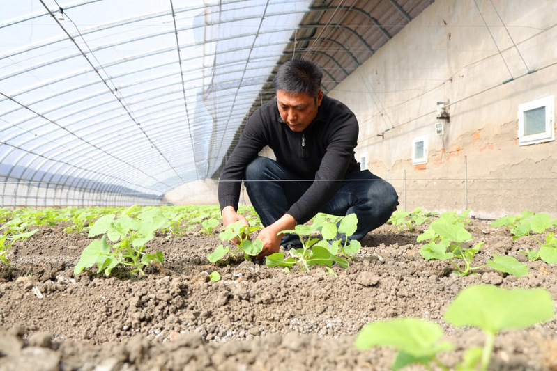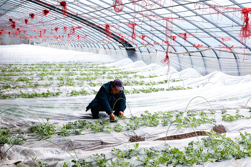 其他大棚里,也滿是搶抓農時的忙碌身影。園區27號大棚里,園區負責人魏建東正蹲在甜瓜苗前,仔細查看它們的長勢情況?!稗r時不等人,隨著瓜苗的生長,我們馬上要進行打杈、澆水,并進行覆膜除草。”魏建東介紹。打杈是為了去除瓜苗上多余的側枝,讓養分能夠集中供應給主枝和果實,從而提高甜瓜的產量和品質。澆水則是根據瓜苗的生長需求,適時補充水分,保證其正常生長。覆膜除草則可以減少土壤水分蒸發,抑制雜草生長,為甜瓜創造一個良好的生長環境。
