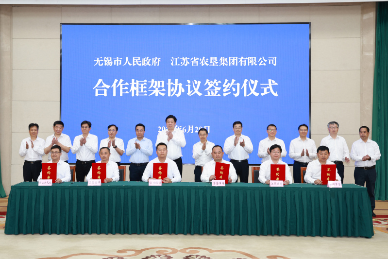 6月20日,集團(tuán)公司與無錫市政府簽署合作框架協(xié)議。無錫市委副書記、市長趙建軍會見集團(tuán)公司黨委書記、董事長吳本輝一行,并共同見證合作簽約。無錫市副市長馬良,市政府秘書長陳壽彬,集團(tuán)公司黨委委員、副總經(jīng)理王立新參加活動。趙建軍對省農(nóng)墾集團(tuán)長期以來給予無錫發(fā)展的關(guān)心支持表示感謝。他說,當(dāng)前無錫正深入學(xué)習(xí)貫徹習(xí)近平總書記對江蘇工作重要講話重要指示精神,認(rèn)真貫徹落實習(xí)近平總書記關(guān)于“三農(nóng)”工作的重要論述,大力實施鄉(xiāng)村振興戰(zhàn)略,全面推進(jìn)耕地保護(hù)“三提兩嚴(yán)”行動,加快農(nóng)業(yè)現(xiàn)代化建設(shè)步伐。希望雙方以此次簽約為契機(jī),充分發(fā)揮省農(nóng)墾集團(tuán)在發(fā)展現(xiàn)代農(nóng)業(yè)方面所具有的規(guī)模、資源、技術(shù)、裝備和管理優(yōu)勢,圍繞土地流轉(zhuǎn)、規(guī)模種植和一體化全農(nóng)服務(wù)等領(lǐng)域加強(qiáng)產(chǎn)學(xué)研合作,攜手培育農(nóng)業(yè)新質(zhì)生產(chǎn)力,努力為保障國家糧食安全、推進(jìn)鄉(xiāng)村全面振興貢獻(xiàn)更大力量。同時,期待雙方不斷拓展在醫(yī)藥健康、生態(tài)環(huán)保、房地產(chǎn)等方面的合作空間,在更寬領(lǐng)域、更深層次實現(xiàn)互利共贏。吳本輝在簡要介紹集團(tuán)生產(chǎn)經(jīng)營情況后表示,無錫農(nóng)業(yè)強(qiáng)、農(nóng)村美、農(nóng)民富,“魚米之鄉(xiāng)”底蘊(yùn)深厚、盛名遠(yuǎn)揚(yáng)。他說,近年來省農(nóng)墾集團(tuán)深入學(xué)習(xí)貫徹習(xí)近平總書記關(guān)于農(nóng)墾工作重要論述,認(rèn)真落實省