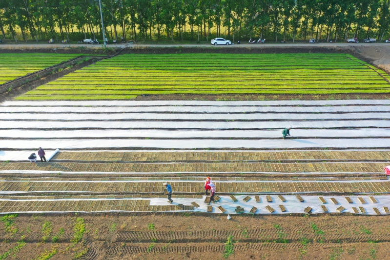 在蘇墾農發崗埠分公司田頭,職工們正在把經“暗化”后的秧盤移到大田里,采用微噴灌技術進行集中育秧,加強精準水肥調控、集中標準化育秧管理,為即將開展的機插秧作業夯實基礎。