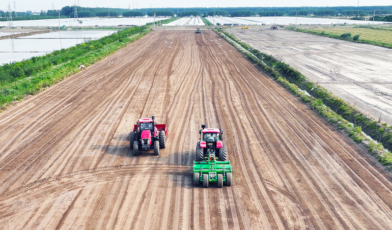 5月25日,蘇墾農發弶港分公司第二生產區8連田間,北斗衛星導航鏟運機、激光平整機等25臺套大型機械來回穿梭,全力推進土地平整進度。