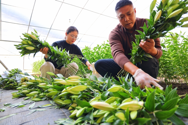 寒冬時(shí)節(jié),崗埠農(nóng)場(chǎng)高效農(nóng)業(yè)示范園11號(hào)大棚內(nèi)一片春意盎然。一株株百合花挺拔站立,不少花苞已露出粉色,在綠葉的襯托下格外嬌艷動(dòng)人。去年,崗埠農(nóng)場(chǎng)高效農(nóng)業(yè)示范園大力發(fā)展鮮切花產(chǎn)業(yè),引進(jìn)了“中國(guó)紅”“索蚌”等百合花品種,共種植14萬(wàn)株。通過(guò)為周邊種植戶(hù)提供技術(shù)指導(dǎo),農(nóng)場(chǎng)帶動(dòng)大家發(fā)展鮮切花產(chǎn)業(yè)。圖為工作人員正在整理百合鮮切花。