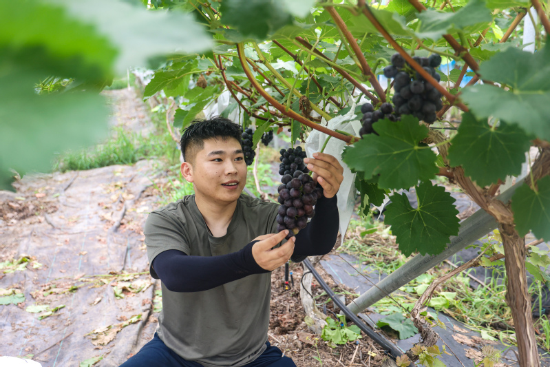 盛夏七月,正是葡萄掛滿枝頭的季節,云臺農場云水灣濕地公園葡萄采摘園的葡萄迎來豐收,吸引眾多游客前來體驗采摘樂趣。走進葡萄采摘園,濃烈的果香沁人心脾,翠綠的葡萄葉下,一串串顆粒飽滿的葡萄掛滿藤蔓間,十分誘人,工作人員正忙著將葡萄采摘、裝箱,一派繁忙火熱的景象。看到農場銷售人員微信朋友圈發布葡萄成熟的消息,游客張女士迫不及待地前來采摘。入園后不到半小時,她就摘了滿滿兩筐紫色的葡萄,她笑著說:“這里的葡萄很甜,每一串都特別好吃,不小心就摘多了。”據悉,云臺農場云水灣濕地公園葡萄采摘園的葡萄早晚熟品種搭配種植,匯集巨峰、夏黑、紅寶石、金手指、陽光玫瑰等20多個品種,目前上市的是夏黑、紅巴拉多品種,采摘期從7月中旬開始,可持續到9月底?!霸婆_葡萄除了有‘國家綠色食品認證’,還被納入《綠色食品標識使用典范(2023)》,2023年還榮獲最美優質農產品(葡萄)企業獎,甜度、口感都是上上佳品。每年我們還會舉辦葡萄采摘節、青少年研學拓展、品秋賞味等活動,讓‘采摘游’成為云臺農場的特色亮點。”云水灣常務副總經理卜馳龍說。